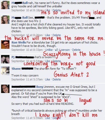 as I wrote that I KNEW one of you would say something like that LOL. you know your quality, total quality, the “I’m not worthy of your air” type quality. but I actually got accused of scripting our facebook fun, ( which you know I am way to lazy to do). Plus where the hell would I find people willing to create facebook accounts friend me and then comment on threads? You can’t script the kind of insanity that takes place on my facebook. YOU young lady have been missing lately.. Glad to see you around? Hows W-man?