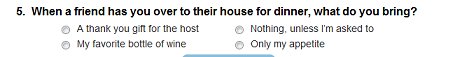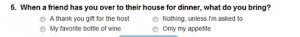Ok, if a friend has me over to dinner what do I bring? Usually my husband and my rapier like wit. Yet amazingly this is not a choice. I don’t bring wine because any friend of mine either already has it or knows I want vodka and we wouldn’t be eating if we were drinking, 2 different events people. However I always ask, ” is there anything we can bring” and is that a choice? NO. Why, because apparently they meant an acquaintance because friends don’t have to have manners, at least my friends don’t.