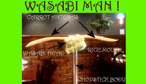 Last week while out having sushi with a friend, I broke food etiquette, wow shocking I know. But a chopstick, wasabi, and carrot strips provided inspiration and if I was famous my Wasbai man would be “art” . So here is my hot art, get it wasabi, hot, oh never mind.