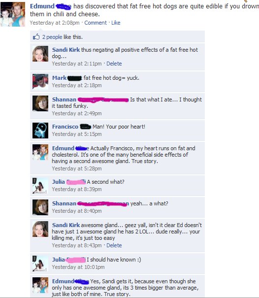 awesome gland, fat free hot dogs, face book