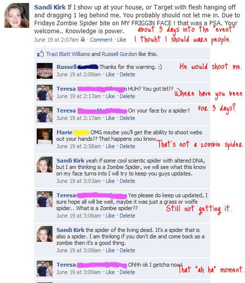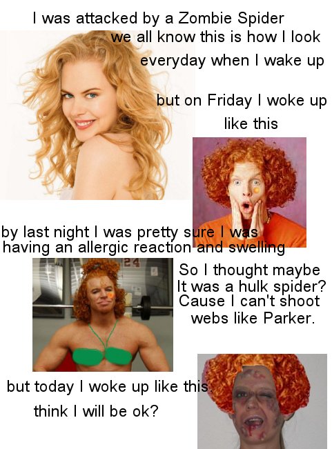 Last week I was attacked and bitten on the face by a zombie spider.  Some friends cheered, some were sad, some were worried and some wanted pictures.  There were over 4  threads all with varying lengths on this topic.  Here is just one.