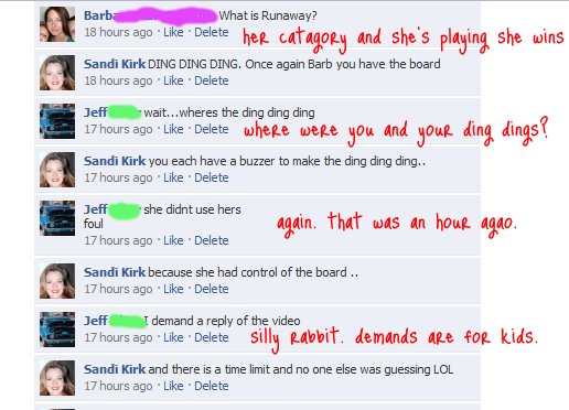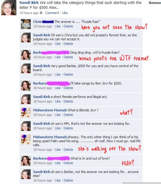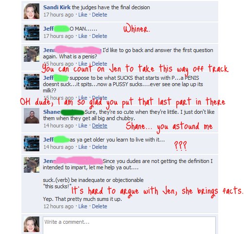 So as you know every Thursday I pull a random wall post from my wall or a friends wall to show you that Facebook should be fun. My facebook friends are lovely, brilliant, funny, and you never know where they will take something. I have friends that I went to middle school, high school, and college with. I have friends I worked with, I have family, then I have friends of friends, and then I have a large portion of friends I never met in real life or we would probably still be in jail. None the less I LOVE LOVE LOVE them all.