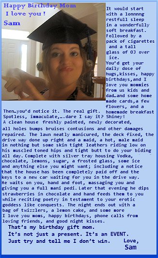 I can honestly say you people have made this one hell of an awesome birthday for me. If more come in or heaven forbid I missed anyone that sent one in, trying to make deadline PLEASE EMAIL ME. Remind me and you will be continued on tomorrows post, aka, Saturday the aftermath, where the winners will also be posted. So come back but probably not to early, you know just in case.. ( I’m hungover)