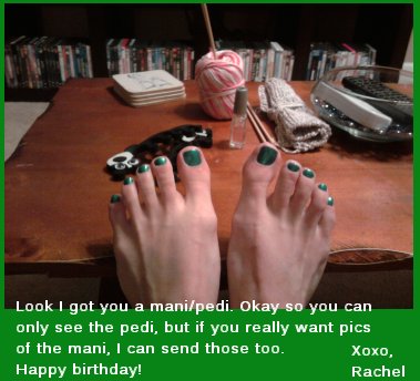 And why would you want to cry anyway?! You now have all the ingredients for a chocolate martini, which you can enjoy while waiting for Brendan to pick you up for your birthday date, which you’ll look fabulous for thanks to your mani/pedi from yours truly (and trust me it does indeed look fabulous!), which is great since he’s taking you to Paris because you know how high fashion those Parisiens are, but just in case anyone gives you shit you can zap them with your disintegrating pistol, and while you’re gone the Chippendale dancers will be cleaning your house, and when you get back ASkars will apparently be waiting in your bed.