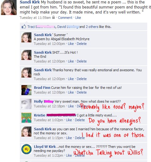 Yep it’s Thursday which means, fun with facebook friends time. Yep this is where I tell you that if your facebook doesn’t look like my facebook then your doing it wrong. I have the bestest Facebook Friends on the planet. I lurve them like chocolate and vodka.