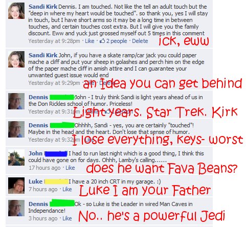 LOL. I did orginially then edited it since it wasn’t my wall and these people really don’t know me. But when you take the initiative to friend request me then your kinda puttin your world in my hands. Still I try to hard to be “polite” even when discussing blow up dolls and schlongin the sheep and stuff.