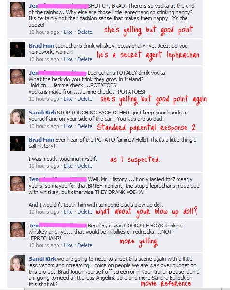 Okay, I’m not sure what to address first. That was like the Iliad of FB posts. Well, first of all, if you sign up for a Victoria’s Secret card, they’ll send you a card every month for free undies, then you can ditch the sappy, pine scented ones. I’m sure this will make both Lloyd and Brad very happy. But most of all, I’m sure it would make you very happy because really who wants to wear panties with tree sap?! And obviously the syphillis has already affected Brad’s brain. Someone send him some penicillin before he starts drooling. It’s like that episode of House where the old lady with syphillis kept hitting on House and he told her she was already nuttier than squirrel shit, and … what was I talking about? Oh yeah, and forward him some of those penis enhancement emails, it sounds like he needs them. And those weren’t leprechauns. They were crackheads (http://www.youtube.com/watch?v=nda_OSWeyn8) so I doubt they were drinking vodka or whiskey. My guess would be moonshine made in the toilet of whatever abandoned building they were living in at the time.