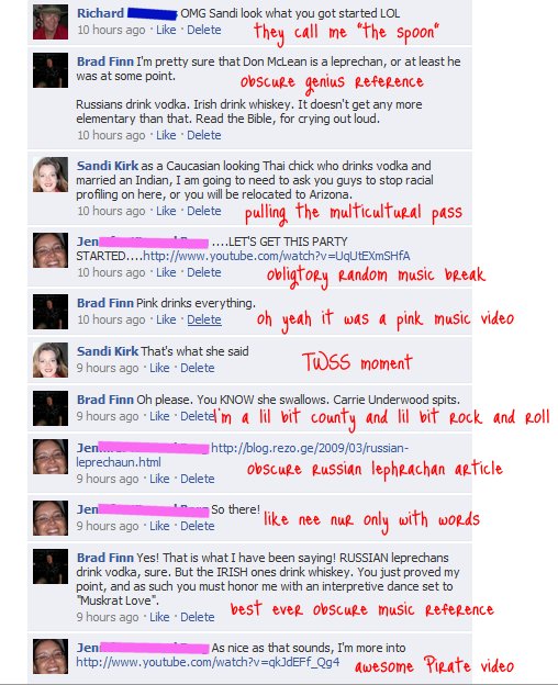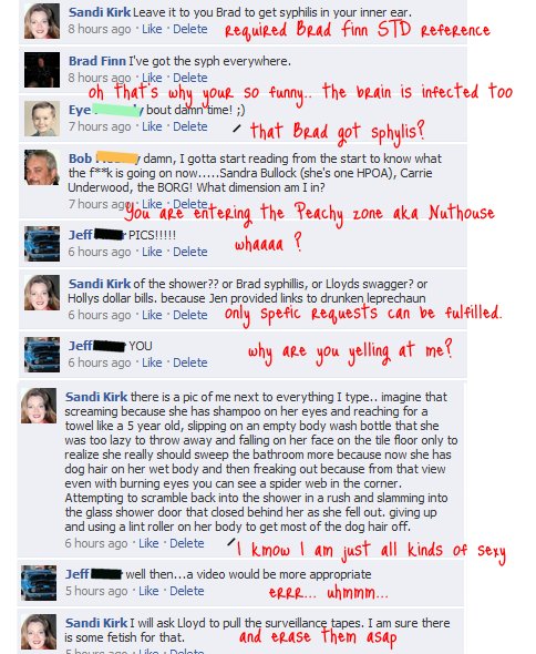 Please know I don’t edit or delete posts or comments off my wall. Also I have only actually met maybe 4 of these people in real life and am married to one of them. My on line friends and off line friends are awesome amazing, brilliant and yes obviously a bit twisted. That is why I love them like cheesecake smothered in vodka sauce served by Brendan Fraser. They make me laugh every day without fail.