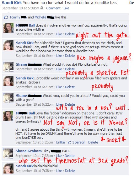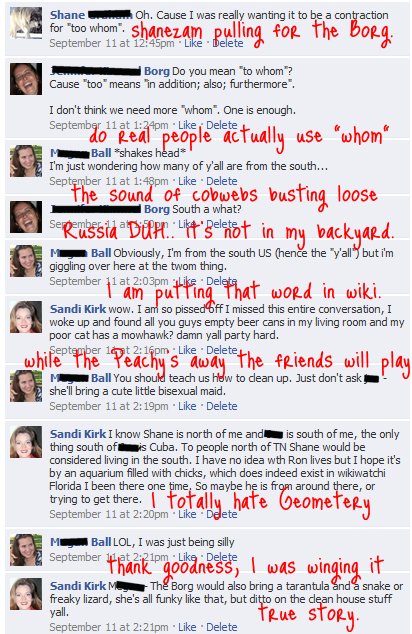 Note to self: for real entertainment get on FB and friend Sandi Kirk and her friends. The conversation is highly intellectual.