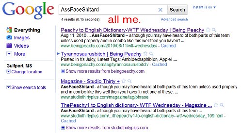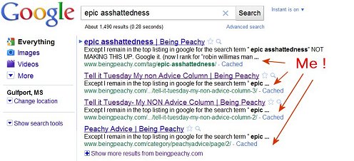 […] Please be advised that I have NO expertise ( despite what the massive spam on my site that I block says). Except I remain in the top listing in google for the search term ” epic asshattedness” NOT MAKING THIS UP. Google it. )(now I rank for several other horrific things including “robin willimas man junk” and “justank… […]
