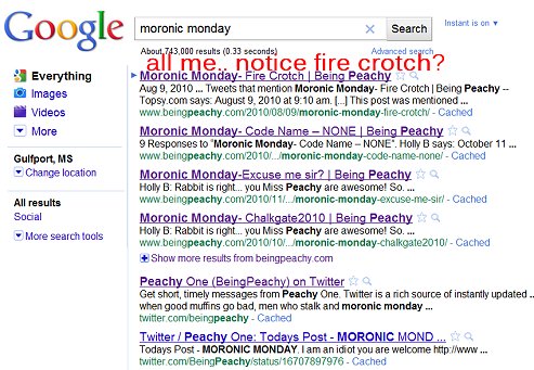 […] This post was mentioned on Twitter by ThePeachy1, ThePeachy1. ThePeachy1 said: while I am gone you can read My Moronic Monday- I think google is stalking me, but I like it http://bit.ly/e7IAh0 […]