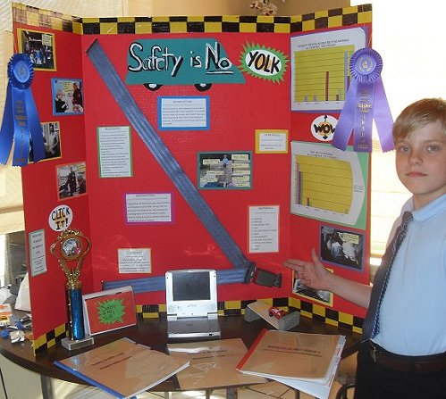 Safety is no yolk. He use Eggs to do a project on safety, eggs have yolks. Hence the pun. Yolk, and safety? It’s in the video and on the board. He’s 9.