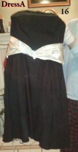 LOVE this Strappless Tea Length, black with creamy attached sash gathered in front to a diamond clip. it does have a wire supporting bustier inside the dress for support and the ability to stay up and fight gravity like the little shit it is. from the sash down, it has a couple layers of sewn in crinoline. A meant to show an inch one with a creamy trim to match the creamy gathered sash. This gown always made me fee so pulled together, like a 50’s house wife wearing a tight bodice puffy crinoline skirt dress along with pearls while she vacuums in her pumps. *crinoline needs a little hand sewing repair*