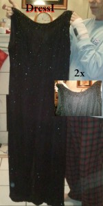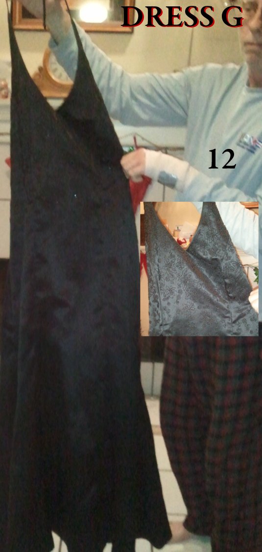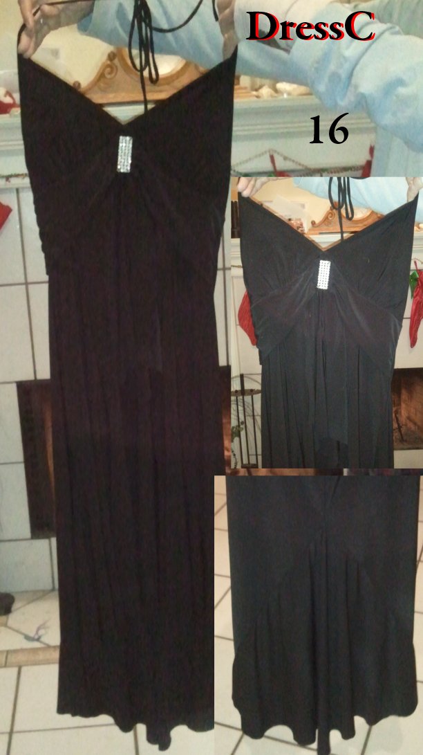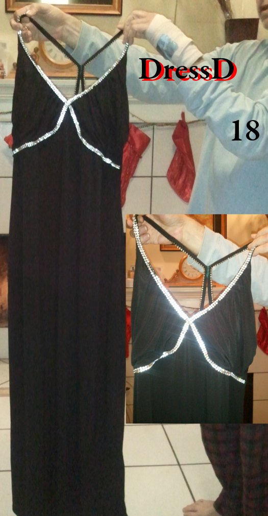 the proverbial little black dress, but as a formal. it’s floor length with fine straps over each shoulder, the material is so light and flowy. Sam wore this Sr Prom, and to formal dinner on our cruise to cozumel. easy breasy slip this baby on it’s pleasin’. it’s layered and flowy and just right to hide little imperfections, at the breast a set of rhinestones gather the pucker at the breast, then a faux flip thru knot is directly below hiding and tummy concerns, the back is astounding, as it goes straight down and then an amazing fan panel glides in the back as you walk.