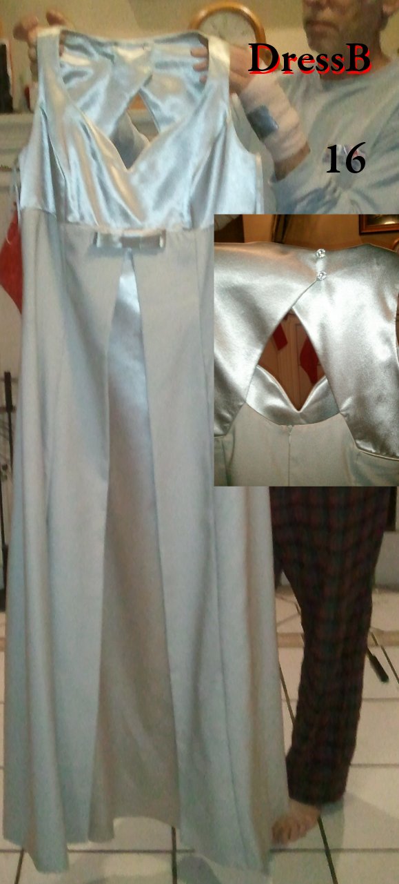 beautiful floor length silver shimmer gown, amazing design at breast, then under princess cut, a double fold to give depth and instantly slim by allowing you to exist under the fold. straight cut, the back sports a diamond cut out with 2 diamond buttons that will be just under the back of your neck. This was my gown for Sams cumming out, sweet 16 Cotillion.